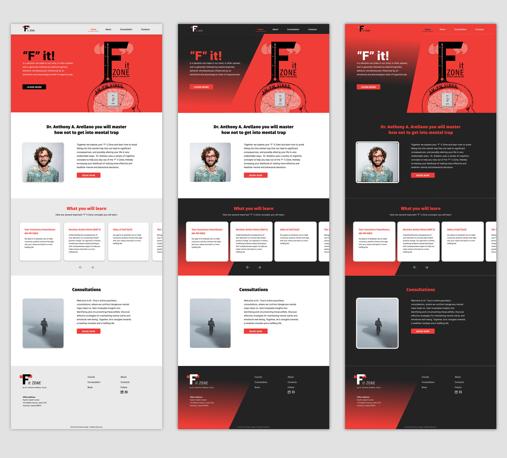 I developed the complete visual identity for The “F” it Zone, including the book cover, logo, and a service-based website for Dr. Arellano’s mental health practice. The project translates a powerful cognitive-behavioral model into a bold, cohesive visual system that reflects the book’s exploration of impulsive decision-making, emotional triggers, and real-world consequences.